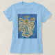 Pintura de um anjo branco e dourado sobre um fundo azul macio.