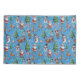 Christmas-themed pattern featuring Santa Claus, reindeer, snowmen, elves, Christmas trees, candy canes, and snowflakes on a blue background