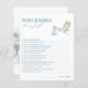 Adicione diversão ao seu chá com este inverno de tempestade azul que conhece o melhor jogo de Mamães. Apresentando uma ilustração de cegonha doce com uma vila de inverno de neve, este jogo imprimível é uma atividade perfeita para um chá de fraldas de menino. Os convidados podem adivinhar os favoritos das mamães e aprender mais sobre ela enquanto criam risos e memórias. Um encantador aditamento ao tema do chá de fraldas de cegos de inverno, este jogo coordena-se lindamente com convites, cartas de obrigado e sinais para uma celebração coesa.