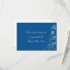 Belas imagens de espiral de diamante falso criam uma borda elegante no lado direito deste cartão de resposta do casamento. As espirais formam folhas e imagens cardíacas em prata brilhante com seu texto em prata no meio. A parte de trás do convite é branca para facilitar a marcação do respondente, com o texto personalizado em azul correspondente. *O Clip art usado neste design é protegido por direitos autorais pela Encore Software, Inc., que permite o uso a seus licenciadores. Todos os direitos reservados. Observe que a imagem está impressa e não contém brilho.