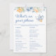 Traga-se para um belo jardim de elegância com nosso Elegante Blue Floral e Citrus What's On Your Phone Bridal Game Card, uma celebração onde a sofisticação encontra o charme refrescante de prazer com a cidade. Essa design é uma mistura perfeita das calmas do azul com a energia vibrante dos limões amarelos para criar um ambiente de puro refinamento. Esta rubrica apresenta delicados florais azuis e limões brancos, com a inclusão graciosa de um bule de chá acrescentando um toque extra de charme. O esquema de cores amarelo e azul se harmoniza na dança da elegância, definindo o tom perfeito para uma tarde cheia de chá, risos e beleza do eterno. Clique no botão "Personalizar" para personalização adicional deste modelo. Você poderá modificar o nome, incluindo o estilo, as cores e os tamanhos. Itens correspondentes disponíveis.