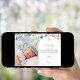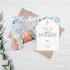 Adicione sua própria foto de tamanho vertical. Um pequeno arco azul colorido em forma de fotograma. Uma cor de fundo branca, decorada com forais azuis, flores. Personalize e adicione um nome e detalhes.