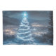 A glowing blue Christmas tree standing peacefully in a snowy landscape. Illuminated by soft winter lights and crowned with a radiant star, the tree shines against a dreamy night sky overlooking a quiet, glowing town below.