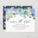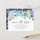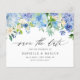 Salve a data! Anuncie sua data de casamento à família e amigos com este cartão floral. Apresenta terra floral de cor d'água, com hífenes azuis e roxas, rosas de marfim e sotaques verdes. Personalize adicionando nomes, data, local e outros detalhes. Estes cartões salve a data de hydrangea são perfeitos para casamentos outono.