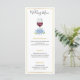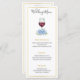 A 4" x 9" wedding menu featuring watercolor blue hydrangeas and a glass of red wine, elegantly framed in gold. The menu includes options for Hors D'oeuvres, Entrées, and Desserts, and the reverse side is customizable with the bride and groom’s names.