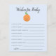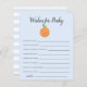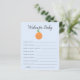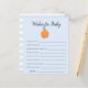 Um chá de fraldas de tema bonito e bonito quer um cartão de bebê com fruta laranja com sorriso. Os textos são editáveis. Atividade perfeita para jogar durante o chá e definitivamente será um excelente! Este design azul é perfeito para o chá de um menino.