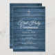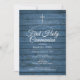 Um convite rústico à primeira comunhão sagrada com seus detalhes especiais personalizados, definidos em tipografia química em um fundo de painéis de madeira azul. Projetado por Thisnotme©