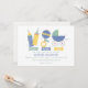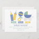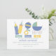 Esta design divertida com ilustrações bonitinhas de garrafas, um chocalho, e carruagem de bebês, em uma doce paleta de cores azul, verde e amarelo, faz um adorável convite para chás de fraldas.