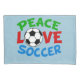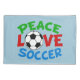 Presente de Natal do Futebol Bonito com as palavras PEACE AMVE SOCCER em vermelho, verde e azul num legal fundo desportivo azul.