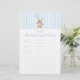 Add a touch of elegance to your teddy bear themed baby boy shower with our sophisticated "Baby predictions and advice" game. Featuring a charming teddy bear wearing a cute blue bow, holding blue balloon, surrounded by blue striped pattern, this delightful activity is perfect for entertaining your guests and creating lasting memories. Ideal for adding fun and excitement to your special celebration!
