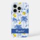 Blue Toile Palm Trees Lemons Monogram Name iPhone. Bring a splash of tropical coastal charm to your daily routine with this lovelyphone case featuring a light blue striped background adorned with sketched blue palm trees and vibrant yellow lemons. Customizable white script lettering, for your name making it a stylish accessory. Choose your case and phone type. Contact the designer for any customization questions.