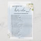 Celebrar a noiva a ser com este elegante jogo Quem Conhece a Melhor Noiva?, desenhado num romântico azul de aquarela e tema de rosa branca. Perfeito para chás de panela e festas de solteira, este jogo permite que os hóspedes testem seu conhecimento da noiva com perguntas pessoais e divertidas. Muito bem projetado para combinar com o seu conjunto de eventos florais, é um encantador estilo e quebra-gelos que combina estilo e entretenimento