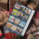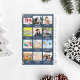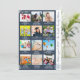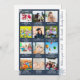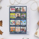 Cartão de Natal ou Feriado azul e branco com 12 imagens fotográficas, flocos de neve e texto para cada mês do ano. Do lado, ele tem a citação "Que ano" e o nome da família ou qualquer texto personalizado que você gostaria de adicionar.