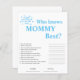 Prepare-se para alguma diversão com o nosso jogo de Chá de fraldas "Quem Conhece Melhor Mamãe" Azul, uma maneira deliciosa de testar o conhecimento da futura mãe dos seus convidados! Nesse jogo, os convidados responderão a perguntas sobre a mãe esperada, como sua comida favorita, seu prazo ou seus desejos. A que tem as respostas mais corretas ganha um doce prêmio! Feito com sotaques azuis encantadores e detalhes adoráveis do coração, este jogo adiciona um toque de doçura às suas festividades de chá de fraldas. É perfeito para envolver convidados e criar risos e memórias juntos.