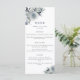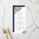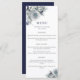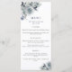 Elegante menu de casamento para o seu casamento no inverno com dois arranjos de flores e bagas aquarelas em azul marinho e azul ardente. Personalize com seus nomes, data e menu de casamento.