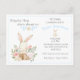 O convite perfeito para aqueles que estão no orçamento. Não é necessária nenhuma compra de envelope. Um belo coelhinho de floresta numa cesta. "Hippity Salto" "Ela está prestes a POP" tipografia. Feito em azul para o chá do bebê.