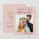 Um elopemento cor-de-rosa com orçamento moderno e chique ou um pequeno anúncio de casamento e recepção salvam a data com sua foto e "Salve a data para nossa festa feliz sempre depois" em uma mistura de simples tipografia e roteiro de tendências com balanços. Adicione seus primeiros nomes e data e local de recepção; no lado oposto, personalize seu anúncio de casamento e suas informações de recepção em mais detalhes.