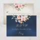 The Blush Floral & Wreath RSVP - Blue features the bride & grooms first initials and a blush pink floral bouquet on a blue background. The back has details for the recipient to fill out. Designed to coordinate with the "Floral & Foil Botanical Wreath" Wedding Collection. To change details, click «Personalize». To move the text or change the text size, font, or color click «Click to customize further» initials