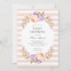 Barato personalizado de convites para chuveiros para bebês personalizados com os detalhes da sua festa. Este bonito design botânico apresenta uma moldura de aquarela de pêssego e flores de lavanda sobre um fundo listrado. Use as ferramentas de design para personalizar o texto, editar as fontes e as cores ou adicionar suas próprias fotos para criar um convite elegante para chá de fraldas floral.