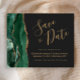 Este elegante orçamento salve o cartão de data apresenta um emerald verde aquarela agate border cortado com falso brilho dourado. O texto personalizável combina um script de manuscrito colorido dourado, fontes copperplate e itálico em um fundo preto de slate. O verso apresenta um design emerald verde e dourado.