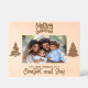 Adicione a sua foto de Natal favorita a este quadro que diz "Feliz Natal" em cima e "Boas notícias de conforto e alegria" em baixo. Dos lados estão duas árvores de Natal