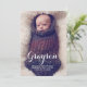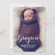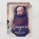 Completamente moderno e simplesmente elegante, esta design é uma maneira perfeita de apresentar seu novo garotinho. Apresenta uma bela tipografia cursiva e duas grandes fotos do seu bebê - uma na frente e outra nas costas. A frente também guarda a informação de nascimento do bebê, e no verso uma área de texto especial para ser personalizada com pais e informações da família.