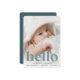 Um design de anúncio de nascimento doce e elegante que apresenta um cheio sangrando fotos horizontais ou paisagísticas com "boas-vindas" sobrepostas em letras retrorreflectoras ao longo do fundo. O nome do seu bebê e as estatísticas de natalidade aparecem abaixo. Adicione uma foto adicional ao verso, juntamente com uma mensagem pessoal.