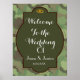 Boas-vindas ao casamento do Exército, poster impressão. Um belo e elegante tema de casamento do exército, no fundo um padrão do exército, em frente a uma fronteira verde do exército com linha de fronteira castanha e texto branco. No ouro de cima anéis de casamento é um casamento único e elegante do exército.