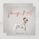 Um cartão de boas-vindas de Natal ou Feriado com um cão Dalmation num chapéu de Papai Noel. Mude facilmente as informações para as suas. Saudações sazonais divertidas e brilhantes.