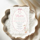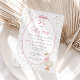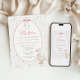 Celebre o seu pequeno convite de chá de fraldas caprichoso, com um charmoso ganso vestindo um arco cor-de-rosa rodeado por delicadas flores silvestres. Com tons de safra suaves e detalhes florais, ele define o tom perfeito para uma doce celebração inspirada no interior.