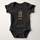 Black baby one-piece bodysuit with the numbers 111,222,333,444,555 in orange from an alarm clock.