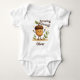 Este traje de bebê personalizado apresenta uma bolota fofa, sorridente com pequenos braços e pernas que se mantêm orgulhosos com uma expressão alegre, simbolizando o crescimento e o potencial. Um pequeno broto surge do seu boné, enquanto a frase brincalhona "Crescendo Forte!" é exibida em uma fonte desenhada à mão. Os tons pastéis macios e os elementos gentis da natureza criam uma vibração fofa, quente e elevadora.