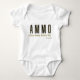 Este macacão-bebê é unisexo e exibe as palavras "AMMO" em uma fina impressão com letras douradas, fazer-esboço preto na sigla A.M.M.O que significa (Movimento Ambicioso Motivando Outros) neste estilo e tema da sigla AMMO Roupa USA. Este fato é um ajustado padrão com etiqueta de rasgão fácil, além de um fecho fácil de três estalos e um fecho de agulha dupla em todas as aberturas.