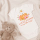 Uma maneira adorável de deixar seus pais saberem que eles foram promovidos aos avós! Um urso bebê bonito é colocado em uma abóbora decorada com flores cor-de-rosa no topo dessa roupa de bebê. A mensagem personalizável abaixo diz "A Little Pumpkin está a caminho." As duas fontes de tendência podem ser personalizadas para personalizar sua mensagem.