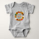 Bebê de uma peça para um agricultor, ou jardineiro, do futuro. Uma coroa vegetal e girassol é a borda do texto personalizado usando diferentes fontes para cada linha. O texto de exemplo é "Futuro produtor de comidas orgânicas". A roupa de cinza é mostrada com uma base branca, que torna a design mais clara. Esta design transfere-se para a maioria dos tamanhos e estilos de roupa. Mais cores também estão disponíveis.