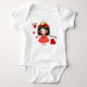 Linda princesinha com rosas vermelhas, vestido vermelho e cabelos escuros