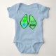 Esta camiseta de bebê apresenta uma imagem gráfica de uma vagem de ervilha verde contendo 2 ervilhas verdes e uma grande ervilha azul. A grande ervilha azul tem um rostinho fofo com olhos e boca. Do outro lado da vagem de ervilha, em texto azul mais escuro, está escrito "Bebê Menino Pronto para Cagar".