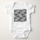Este casaco de bebê tem um design de quadrados Boho com padrões em preto e branco.