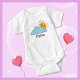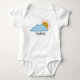Body de bebê fofo, amarelo feliz do sol espiando de uma grande nuvem azul com um modelo abaixo para adicionar seu nome, citação, texto ou excluir para deixar em branco.