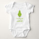 Um traje de bebê comida com um trocadilho comida positivo: "Estou além do comPEAR", e apresenta um personagem de desenho animado de pera bonito, sorridente, verde.