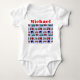 Este macacão-bebê tem um design de caminhões e ônibus novidade em vermelho, azul, verde e marrom em um campo de azul claro.