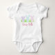 Este belo traje pode ser personalizado com o nome do seu filho. Apresenta um trio de coelhos pastéis e aquosos com rabos fofinhos e fofinhos sentados na grama. Este design funciona melhor com camisa branca ou impressão vívida.