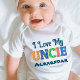 Um traje de bebê com o ditado "Eu amo meu tio com o nome personalizado" é uma roupa doce e carinhosa de criança. O ditado expressa o profundo amor e afeto que uma tia-avó tem por sua sobrinha ou sobrinho. A frase "Eu amo meu tio" é uma expressão popular usada para transmitir a magnitude do amor que se sente por outra pessoa. O traje de bebê com este ditado é uma maneira emocionante e sentimental de expressar amor e afeto por um pequeno. É uma escolha excelente para o tio excelente que quer mostrar à sua sobrinha ou sobrinho o quanto eles amam e se importam com eles.