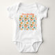 Este casaco de bebê tem uma design moderna do século médio de círculos concêntricos em ouro, laranja e turquesa sobre um fundo branco.