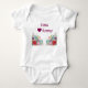 Celebrar o nascimento de uma menina de um amigo com este belo traje branco esportivo dos textos personalizáveis Emma [coração] / ama Mamães, em letras cor-de-rosa-escuro (framboesa-escura), com dois buquês idênticos de flores, adequados para meninas que são metade de irmãs gêmeas ou irmãos. Lembre-se de que você pode personalizar o nome Emma e a Mamãe (com a avó, por exemplo).