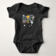 Celebre o marco especial do seu filho com este macacão de bebê de aniversário temático de espaço sideral mágico. Apresenta planetas imaginários, lua e estrelas em tons de azul-marinho e dourado. Este Macacão de Bebê de Aniversário do Espaço Sideral com Sol, Lua, Estrelas e Planetas é perfeito para uma festa de aniversário simples. O design moderno e caprichoso apresenta um fundo azul-marinho em aquarela adornado com um sol amarelo vibrante, lua cinza sorridente, planetas em cores pastéis e estrelas douradas espalhadas com brilho.