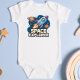 Este macacão-bebê possui um crachá de explorador de espaço arrojado e vibrante. Um foguete de desenho animado voa pelo espaço com planetas ao seu redor.