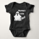 Este é um belo traje de bebê do Halloween que pode ser vestido como uma fantasia simples para o Halloween. A imagem mostra um fantasma adorável com as palavras "Pequeno Boo da Mamãe!" O texto é personalizável para que você possa alterá-lo por conta própria ou usá-lo como está.