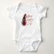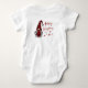 Feriado de bebê, estilo russo, One-Piece com "Feliz Natal" e o ano em roteiro de caligrafia na moda vermelho. Este design único (na frente e no banco) apresenta um gnomo de menina em sua roupa de feriado de xadrez de búfalo vermelha com chapéu e acentuado por estrelas de floco de neve.