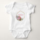 Este body precioso para uma menina bebê tem uma moldura dupla de arame dourado com um buquê floral de flores roxas, rosas e rosa pintadas em aquarela. Dentro da moldura você personaliza com o nome da sua bebê.